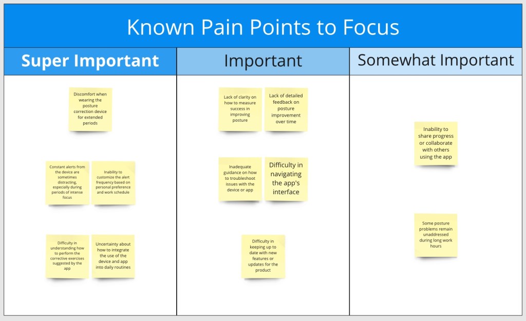 Background: A Silicon Valley startup SpineAlign, recognized an increasing problem: more and more people were suffering from bad posture due to prolonged sitting and usage of computers and smartphones. The startup began by conducting surveys and interviews with people who had identified poor posture as a concern. They observed people in their daily routines at home and the office, looking at how they sat, stood, and interacted with their devices. They discovered that people were often unaware of their poor posture and lacked the right tools and knowledge to correct it. The team came up with an idea to develop a wearable device that alerts users when they have poor posture, an interactive app providing corrective exercises, and an educational platform to inform users about the importance of good posture and how to achieve it. The startup produced an initial batch of the wearable devices and distributed them to early adopters group, along with access to the new app. Users were asked to use the product for several weeks and provide feedback.
