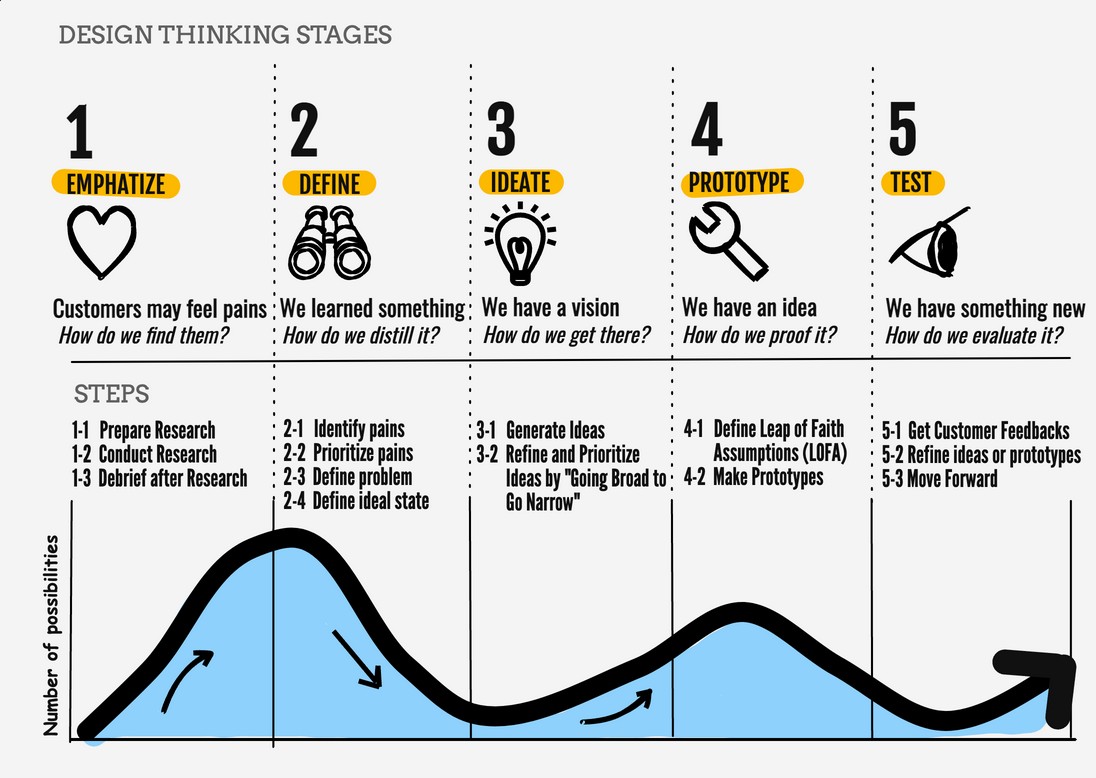The PROTOTYPE stage is the 4th stage of the design thinking process, and it’s all about proving assumptions and creating rough and low-fidelity models of the most promising solutions generated in the previous IDEATE stage. In this stage, our goal is to create something tangible that can be tested and evaluated by customers and users.