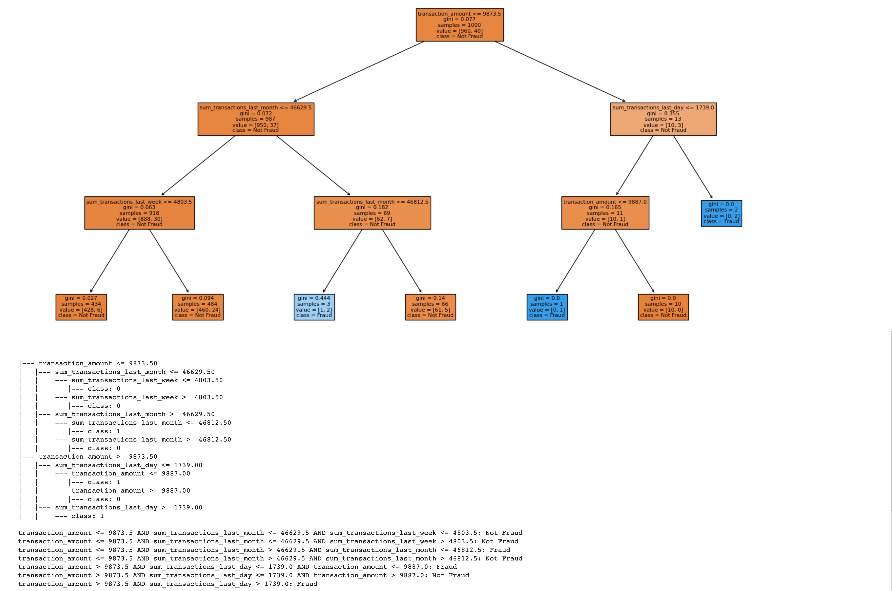In the visualization, each node represents a decision based on a feature value, and each path from the root to a leaf node represents a rule. The leaf nodes display the predicted outcome, either ‘Fraud’ or ‘Not Fraud.‘