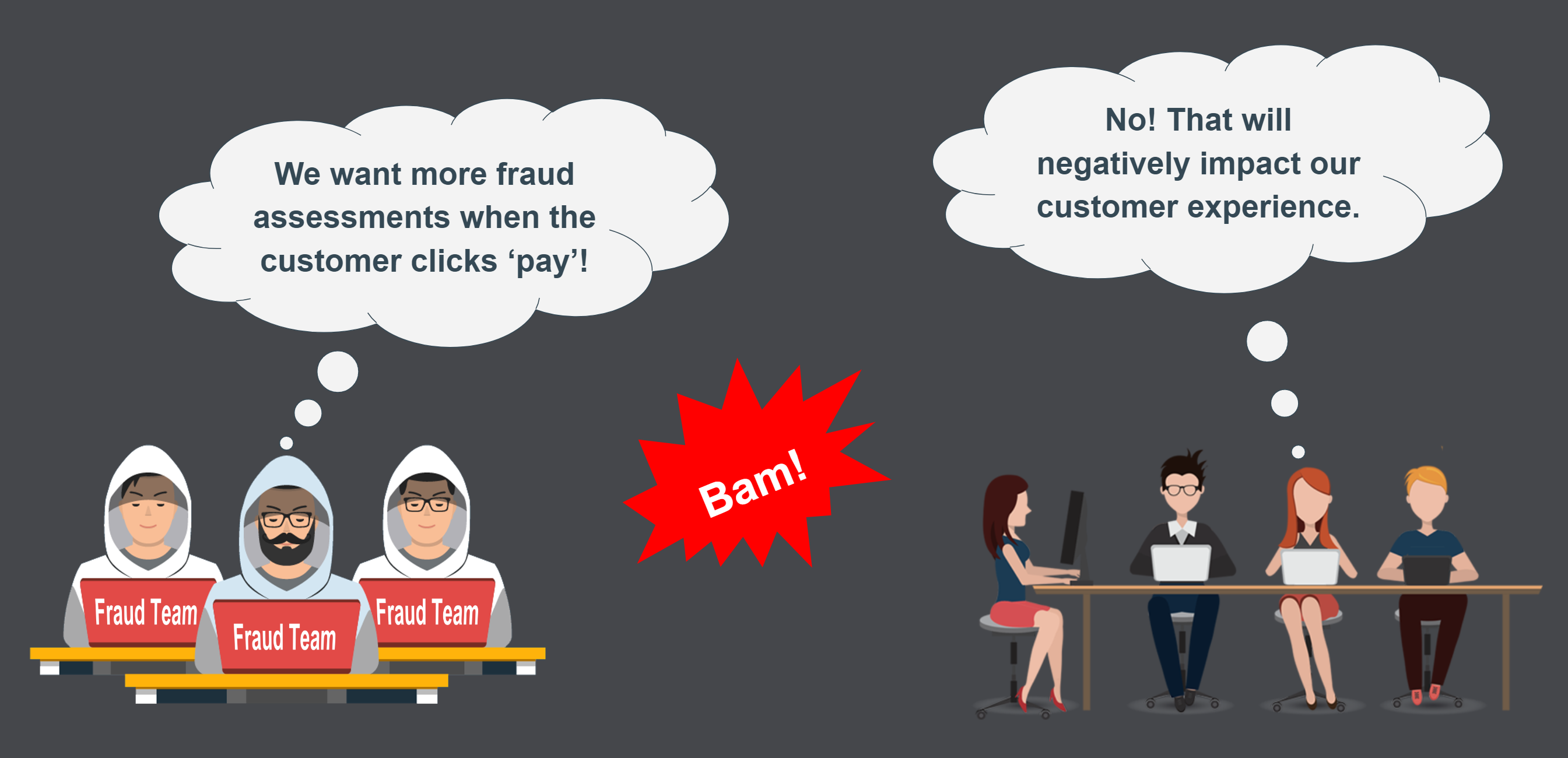 The teams face a conflict: one team is focused on safeguarding the web application from fraud, while the product team is concerned about not compromising the customer experience.
